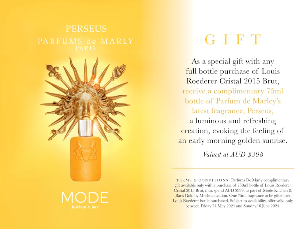 As a special gift from Parfum De Marly, every guest enjoying the Gold By Mode offering will receive a discovery sampler of the new Perseus Eau de Parfum, and with the purchase of a full bottle of Louis Roederer Cristal 2015 Brut, receive a 75ml bottle of Parfum De Marley’s, Perseus Eau de Parfum, to let the golden experience linger, 75ml bottle valued at AUD 398.
